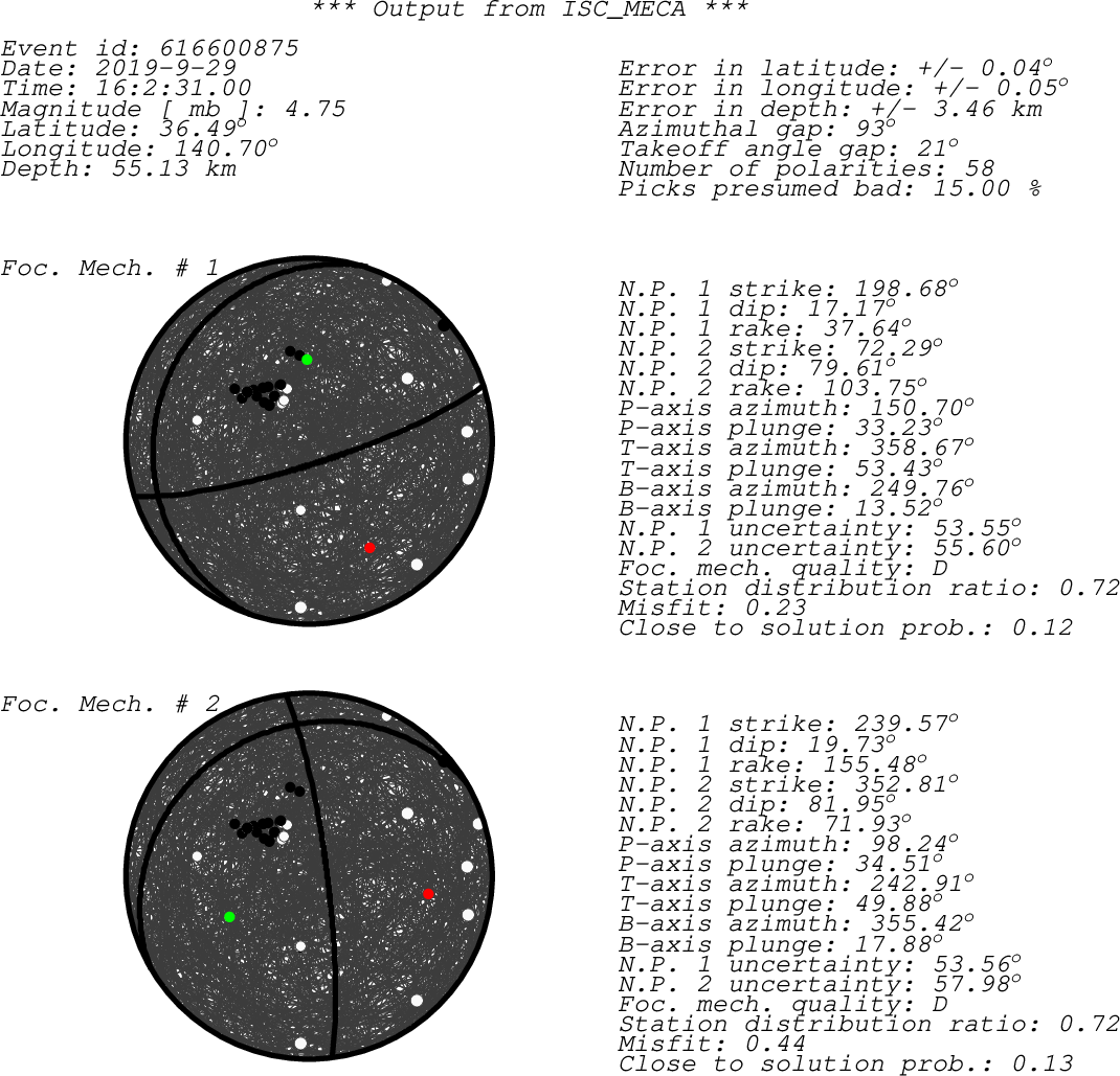 sta chan net loc pol a/m azi dist author irsta JYT ??? IR D 237.60 0.49 JMA JYT JAG ??? IR D 266.62 1.01 JMA JAG JKT ??? IR D 283.64 1.20 JMA JKT JFY ??? IR D 319.07 1.22 JMA JFY JMM ??? IR D 2.92 1.37 JMA JMM JMM BHZ JP -- - a 2.81 1.38 ISC JMM JSG BHZ JP -- + a 229.37 2.74 ISC JSG JGF BHZ JP -- - a 252.93 2.86 ISC JGF YUK S?Z IR D 26.01 8.50 MOS YUK BNX ??? IR c 316.82 13.62 BJI BNX HNS ??? IR d 280.31 20.78 BJI HNS YAK B?Z IR C 348.34 26.48 MOS YAK ULN B?Z IR C 305.27 27.20 MOS ULN TIXI B?Z IR C 353.62 35.76 MOS TIXI MK31 B?Z IR C 302.47 43.93 MOS MK31 KUR11 BHZ KZ -- - a 308.27 45.79 ISC KUR11 KUR12 BHZ KZ -- - a 308.28 45.81 ISC KUR12 KUR14 BHZ KZ -- - a 308.30 45.85 ISC KUR14 KUR01 BHZ KZ -- + a 308.45 45.86 ISC KUR01 KUR02 BHZ KZ -- + a 308.42 45.86 ISC KUR02 KUR03 BHZ KZ -- + a 308.40 45.87 ISC KUR03 KUR07 BHZ KZ -- + a 308.26 45.90 ISC KUR07 KUR08 BHZ KZ -- + a 308.24 45.91 ISC KUR08 KUR17 BHZ KZ -- - a 308.34 45.93 ISC KUR17 KUR18 BHZ KZ -- + a 308.35 45.95 ISC KUR18 KUR19 BHZ KZ -- + a 308.35 45.97 ISC KUR19 KUR20 BHZ KZ -- + a 308.36 45.98 ISC KUR20 BORK B?Z IR C 312.57 50.55 MOS BORK WB9 BHZ AU -- - a 187.16 56.29 ISC WB9 WB5 BHZ AU -- - a 187.17 56.38 ISC WB5 WB4 BHZ AU -- + a 187.17 56.41 ISC WB4 WC2 BHZ AU -- - a 187.16 56.43 ISC WC2 WC1 BHZ AU -- - a 187.19 56.43 ISC WC1 WR8 BHZ AU -- - a 187.01 56.45 ISC WR8 WR9 BHZ AU -- - a 186.99 56.45 ISC WR9 WR7 BHZ AU -- - a 187.03 56.45 ISC WR7 WB2 BHZ AU -- - a 187.18 56.45 ISC WB2 WR4 BHZ AU -- - a 187.11 56.45 ISC WR4 WR5 BHZ AU -- - a 187.09 56.45 ISC WR5 WR6 BHZ AU -- - a 187.06 56.45 ISC WR6 WR3 BHZ AU -- - a 187.13 56.45 ISC WR3 WC4 BHZ AU -- - a 187.19 56.47 ISC WC4 ARTI B?Z IR C 318.62 56.50 MOS ARTI ARTI BHZ II 10 + a 318.62 56.50 ISC ARTI ABKAR BHZ KZ -- + a 310.20 57.85 ISC ABKAR KIRV B?Z IR C 322.94 60.34 MOS KIRV RMF HHZ HE -- + a 333.40 65.95 ISC RMF JOF HHZ HE -- + a 331.84 66.17 ISC JOF KEF HHZ HE -- - a 333.10 69.02 ISC KEF KBZ B?Z IR C 310.50 70.82 MOS KBZ NC403 BHZ NO 00 - a 336.89 74.31 ISC NC403 AKASG B?Z IR C 322.09 74.38 MOS AKASG AKBB B?Z IR C 322.09 74.38 MOS AKBB NC203 BHZ NO 00 + a 337.34 74.43 ISC NC203 ILGA BHZ TU -- + a 312.30 77.92 ISC ILGA BRTR B?Z IR C 311.27 78.78 MOS BRTR FUORN BHZ CH -- - a 328.28 86.06 ISC FUORN FUORN HHZ CH -- - a 328.28 86.06 ISC FUORN CESI BHZ IV -- - a 324.54 87.70 ISC CESI sta - Station code (FDSN) chan - channel code net - Network code (FDSN) loc - Location code (FDSN) pol - Polarity a/m - Automatic or manual pick azi - Event to station azimuth (in degrees) dist - Event to station distance (in degrees) author - Author of the polarity irsta - International registry station code