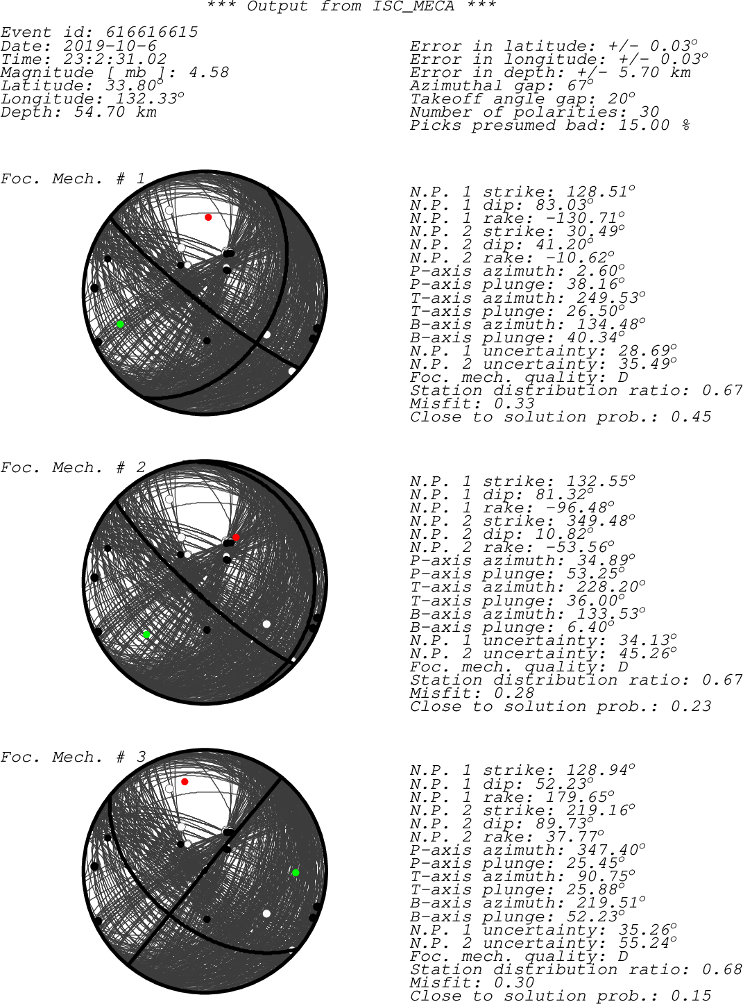 sta chan net loc pol a/m azi dist author irsta JNA ??? IR D 152.58 0.27 JMA JNA JKD ??? IR D 304.16 0.46 JMA JKD UWA2 ??? IR D 157.00 0.63 JMA UWA2 JMN BHZ JP -- + a 92.48 1.29 ISC JMN JTU BHZ JP -- + a 287.49 2.54 ISC JTU NAWB BHZ KS -- + a 293.09 4.38 ISC NAWB JGF BHZ JP -- + a 65.06 4.51 ISC JGF CHJ2 BHZ KS -- - a 311.99 4.70 ISC KSCHJ HNS ??? IR c 289.08 14.78 BJI HNS H19K BHZ TA -- - a 30.01 52.05 ISC H19K J19K BHZ AK -- + a 31.96 52.40 ISC J19K K20K BHZ AK -- - a 32.73 53.12 ISC K20K WB9 BHZ AU -- + a 177.59 53.32 ISC WB9 WR5 BHZ AU -- + a 177.54 53.48 ISC WR5 WC3 BHZ AU -- - a 177.61 53.49 ISC WC3 WC4 BHZ AU -- + a 177.65 53.49 ISC WC4 L22K BHZ TA -- + a 33.61 54.69 ISC L22K H23K BHZ AK -- - a 29.51 54.89 ISC H23K E24K BHZ TA -- - a 26.72 55.12 ISC E24K SCRK BHZ AK -- + a 31.32 57.50 ISC SCRK I28M BHZ TA -- - a 29.19 58.88 ISC I28M G30M BHZ TA -- - a 27.01 59.95 ISC G30M I30M BHZ TA -- + a 28.99 60.38 ISC I30M BUR31 BHZ RO -- + a 318.24 75.99 ISC BUR08 DLMT BHZ IW 00 - a 40.19 81.73 ISC DLMT UCC BHZ IR - 329.81 84.10 UCC UCC WLF BHZ IR - 328.18 84.18 UCC WLF BMRD BHZ IR - 329.28 84.30 UCC BMRD PSUT HHZ UU 01 + a 46.04 85.42 ISC PSUT SRU BHZ UU 01 + a 43.89 87.00 ISC SRU sta - Station code (FDSN) chan - channel code net - Network code (FDSN) loc - Location code (FDSN) pol - Polarity a/m - Automatic or manual pick azi - Event to station azimuth (in degrees) dist - Event to station distance (in degrees) author - Author of the polarity irsta - International registry station code