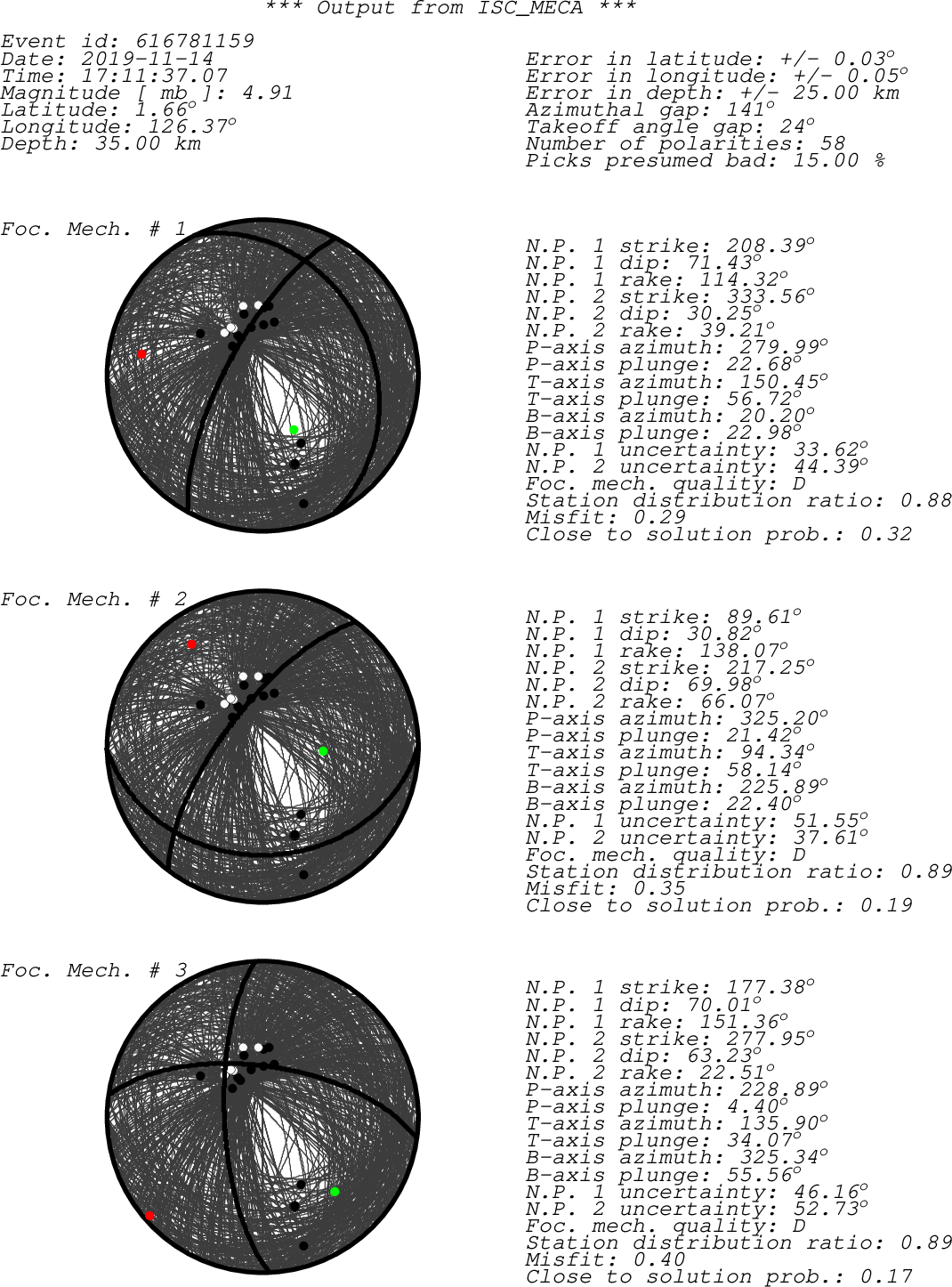 sta chan net loc pol a/m azi dist author irsta DRS SHZ AU 00 + a 162.31 14.70 ISC DRS WB10 BHZ AU -- - a 160.09 22.70 ISC WB0 WB9 BHZ AU -- + a 160.13 22.72 ISC WB9 WB8 BHZ AU -- + a 160.16 22.74 ISC WB8 WB7 BHZ AU -- - a 160.19 22.76 ISC WB7 WB5 BHZ AU -- - a 160.25 22.79 ISC WB5 WB3 BHZ AU -- + a 160.32 22.83 ISC WB3 WC2 BHZ AU -- + a 160.29 22.84 ISC WC2 WRAB B?Z IR C 160.34 22.84 MOS WRAB WR1 BHZ AU -- + a 160.37 22.84 ISC WR1 WRA B?Z IR C 160.37 22.84 MOS WRA WB2 BHZ AU -- + a 160.34 22.85 ISC WB2 WR2 BHZ AU -- + a 160.32 22.86 ISC WR2 WB1 BHZ AU -- + a 160.37 22.86 ISC WB1 WC4 BHZ AU -- + a 160.39 22.86 ISC WC4 WR3 BHZ AU -- + a 160.27 22.86 ISC WR3 WC3 BHZ AU -- + a 160.31 22.87 ISC WC3 WR4 BHZ AU -- + a 160.22 22.87 ISC WR4 WR5 BHZ AU -- + a 160.17 22.88 ISC WR5 WR6 BHZ AU -- - a 160.12 22.89 ISC WR6 WR9 BHZ AU -- + a 159.99 22.92 ISC WR9 QIS BHZ AU -- + a 150.23 25.60 ISC QIS CMAR B?Z IR C 303.59 31.66 MOS CMAR HNS ??? IR d 344.54 37.16 BJI HNS SNY ??? IR d 356.76 40.07 BJI SNY SNY BHZ CB 00 - a 356.76 40.07 ISC SNY MSHR B?Z IR C 5.39 40.97 MOS MSHR BNX ??? IR c 1.04 43.91 BJI BNX ULN B?Z IR C 342.83 48.98 MOS ULN MK31 B?Z IR C 326.13 59.06 MOS MK31 MAKZ HHZ IU 00 - a 326.00 59.24 ISC MAKZ ASAI HHZ KC -- - a 317.77 59.52 ISC ASAI AAK B?Z IR C 318.73 61.66 MOS AAK KUR11 BHZ KZ -- - a 328.13 63.20 ISC KUR11 KUR12 BHZ KZ -- + a 328.12 63.22 ISC KUR12 KUR13 BHZ KZ -- - a 328.12 63.23 ISC KUR13 KUR14 BHZ KZ -- - a 328.11 63.25 ISC KUR14 KUR09 BHZ KZ -- - a 328.01 63.26 ISC KUR09 KUR08 BHZ KZ -- + a 328.03 63.27 ISC KUR08 KUR15 BHZ KZ -- + a 328.10 63.27 ISC KUR15 KUR07 BHZ KZ -- - a 328.05 63.27 ISC KUR07 KURK B?Z IR C 328.21 63.30 MOS KURK KUR05 BHZ KZ -- - a 328.11 63.30 ISC KUR05 KUR04 BHZ KZ -- + a 328.13 63.30 ISC KUR04 KUR16 BHZ KZ -- - a 328.08 63.31 ISC KUR16 KUR03 BHZ KZ -- + a 328.15 63.31 ISC KUR03 KUR02 BHZ KZ -- - a 328.17 63.32 ISC KUR02 KUR17 BHZ KZ -- - a 328.07 63.33 ISC KUR17 KUR01 BHZ KZ -- - a 328.19 63.33 ISC KUR01 KUR18 BHZ KZ -- - a 328.06 63.35 ISC KUR18 KUR19 BHZ KZ -- - a 328.06 63.37 ISC KUR19 KUR20 BHZ KZ -- - a 328.05 63.38 ISC KUR20 SEY B?Z IR C 12.88 64.12 MOS SEY TIXI B?Z IR C 0.84 69.91 MOS TIXI NRIK B?Z IR C 346.50 72.35 MOS NRIK ARTI B?Z IR C 327.99 76.57 MOS ARTI KIRV B?Z IR C 328.97 81.80 MOS KIRV KBZ B?Z IR C 313.61 84.14 MOS KBZ sta - Station code (FDSN) chan - channel code net - Network code (FDSN) loc - Location code (FDSN) pol - Polarity a/m - Automatic or manual pick azi - Event to station azimuth (in degrees) dist - Event to station distance (in degrees) author - Author of the polarity irsta - International registry station code