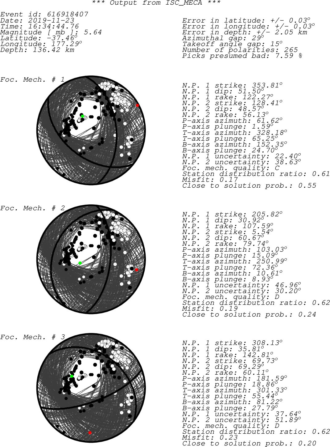 Black dots -> compressions (C,c,+,U,u) White dots -> dilatations (D,d,-) Green dot -> T-axis Red dot -> P-axis